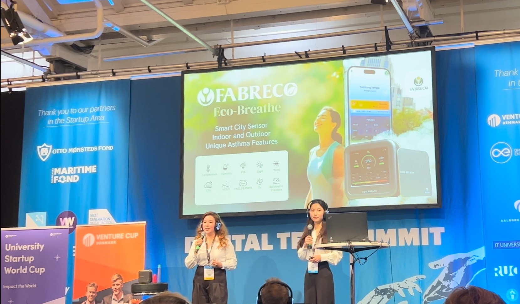 FABRECO團隊在丹麥數位科技峰會登臺亮相,向現場參與者及評審團隊介紹其創新產品。該產品為智慧城市設計的空氣品質感測裝置,整合即時數據回饋系統,專注於改善個人及公共空間的健康指標。這款產品將永續發展與便利性相結合,為現代城市居民提供即時的空氣品質資訊,以便更好管理日常生活中的健康風險。FABRECO團隊的產品不僅是一個健康管理工具,更代表永續發展的生活方式,得到現場與會者、評審的高度肯定及讚賞,一舉拿下競賽中健康類別組冠軍。Venture Cup執行長Morten Ugelvig在頒獎典禮上特別表揚FABRECO來自臺灣的創業精神,並高度肯定團隊在推動健康創新及跨國合作上的努力。