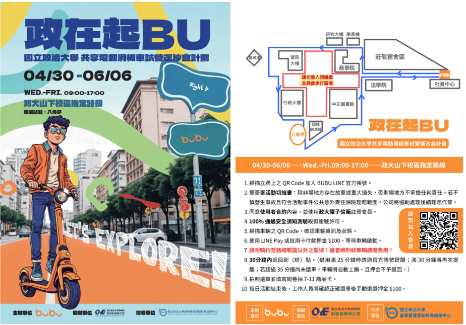 本次沙盒計畫也是政大創新創業教育實踐的重要一環,展現政大對學生創業精神的重視與支持。藉由校園作為實驗場域,提供學生創業團隊寶貴的實戰經驗,並建立學生、校方、外部資源三方合作模式,為未來更多創新方案提供良好示範。未來,BUBU E-Scooter 將持續優化產品與服務,深入分析使用者數據與回饋,探索共享移動在校園場域的可行應用,朝向實現永續交通與智慧校園目標邁進。